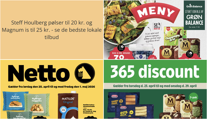Meny tilbyder Magnum eller Frisko is i forskellige varianter, 3-8 stk. pr. æske, til kun 25 kr. pr. æske. Dette tilbud er gyldigt fra fredag den 24. april til torsdag den 30. april.